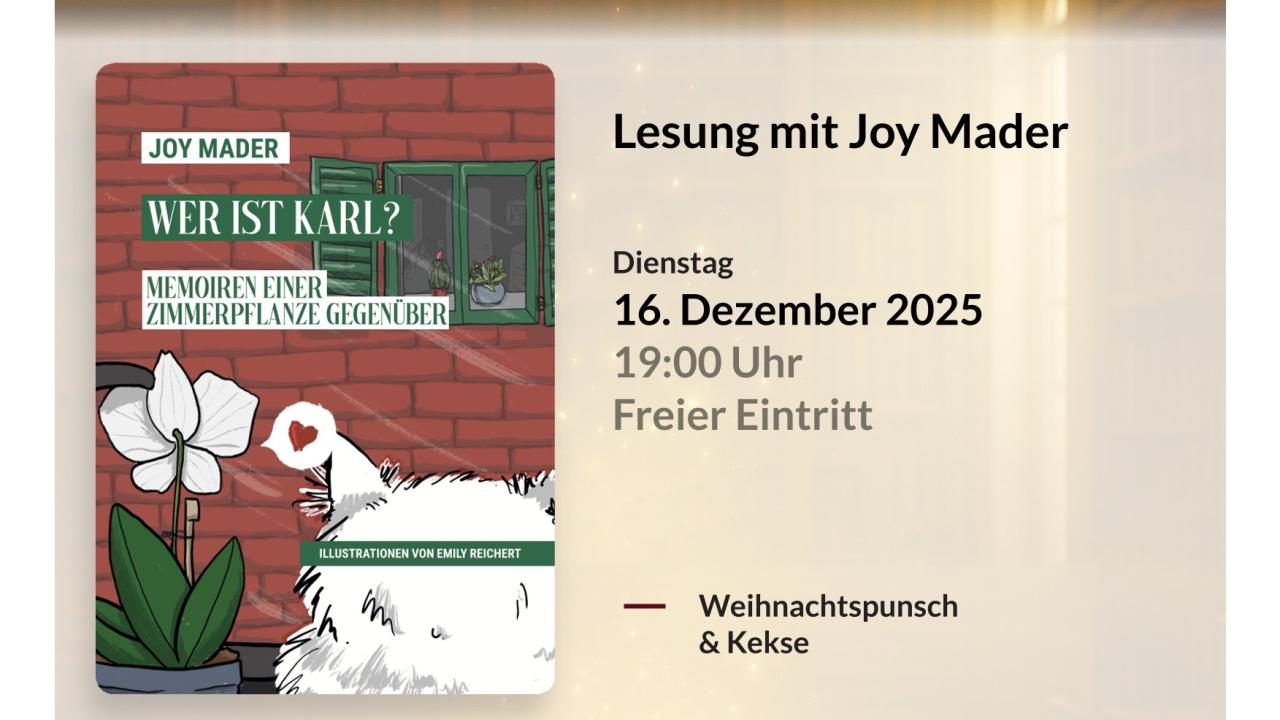 16.12.2025 Lesezauber im Advent mit Joy Mader Bei Weihnachtskekse und Punsch stellt die Ennser Künstlerin Joy Mader am 16. Dezember 2025 ihr zweites Buch vor : "Wer ist Karl? Memoiren einer Zimmerpflanze gegenüber".